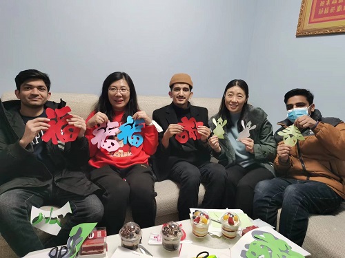 走访的第二站是也门籍杜仁德、巴基斯坦籍白嘉和尼泊尔籍马俊德3名男生的家,让人意外的是小伙子们把家中打扫得干净整洁,为欢迎老师们的到来还特意准备了甜点,点点滴滴的细节透露出留学生的真挚情感和用心。老师们与留学生一起剪纸,制作福字、窗花等作品,增进留学生对中国传统文化的了解和认同。