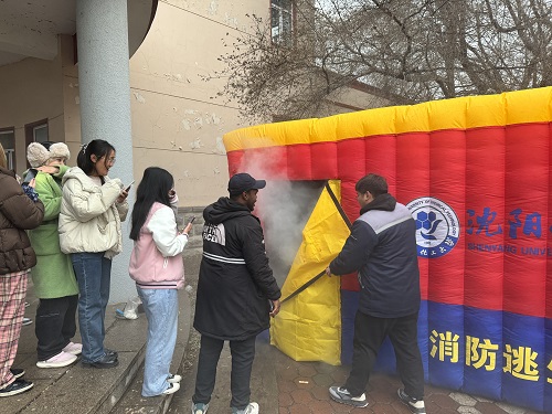 活动中,刘老师向师生们介绍了各种消防器材的使用,并在现场一一做了演示。另外,老师们利用充气逃生舱为模拟着火点,参加演练的同学在现场疏导员的引导下,用毛巾、衣物掩住口鼻,迅速有序地进入逃生舱,亲身体验突发火情事件的有效处理过程。