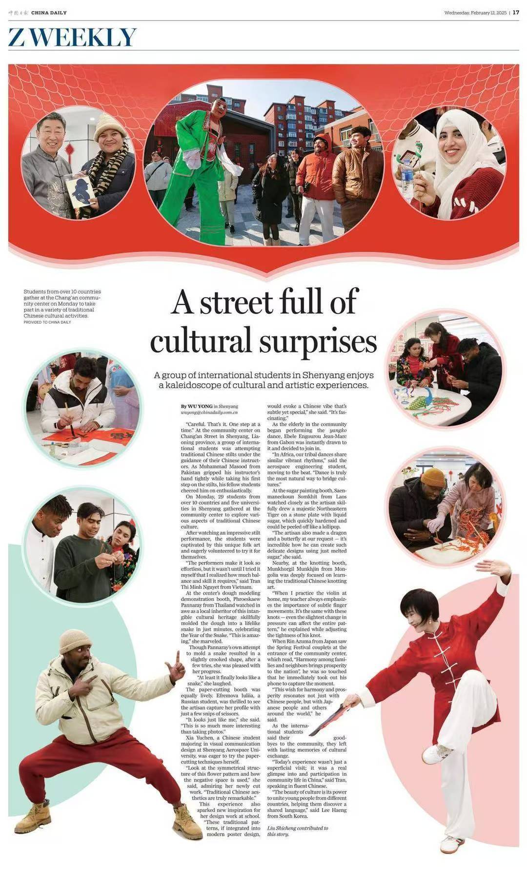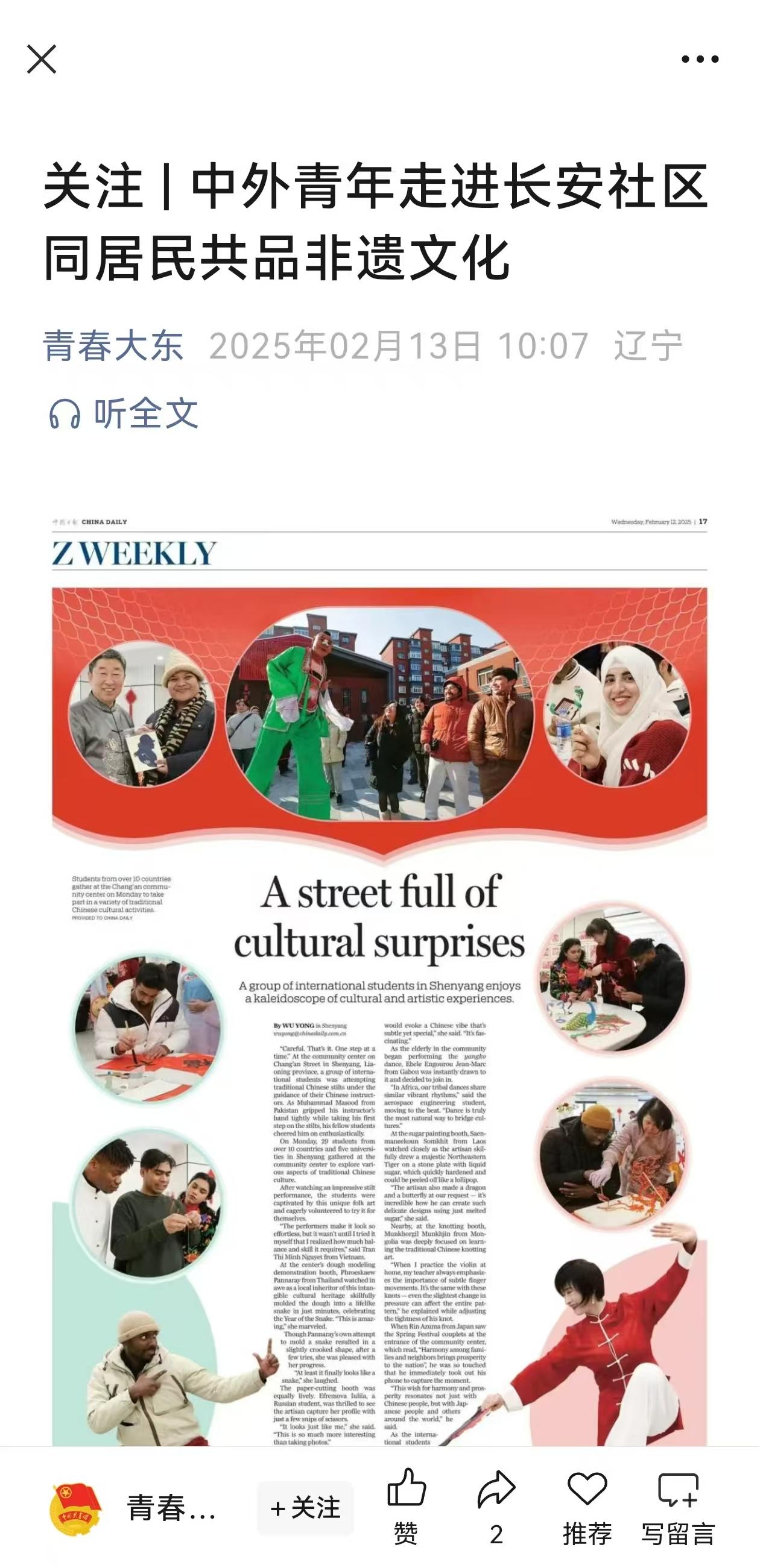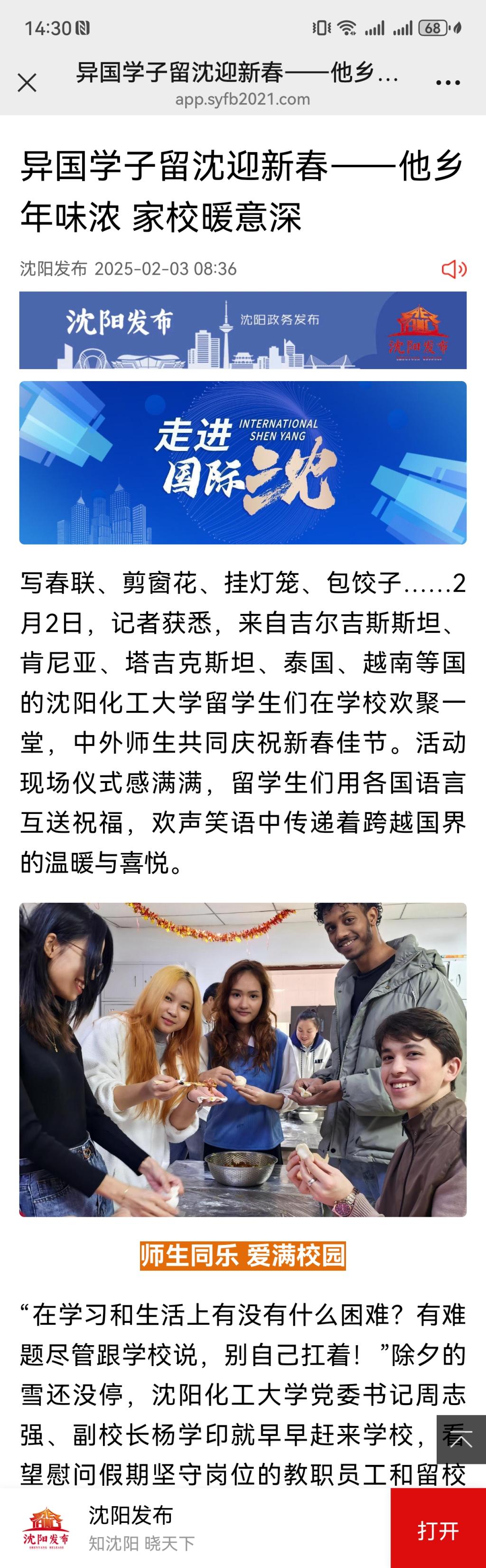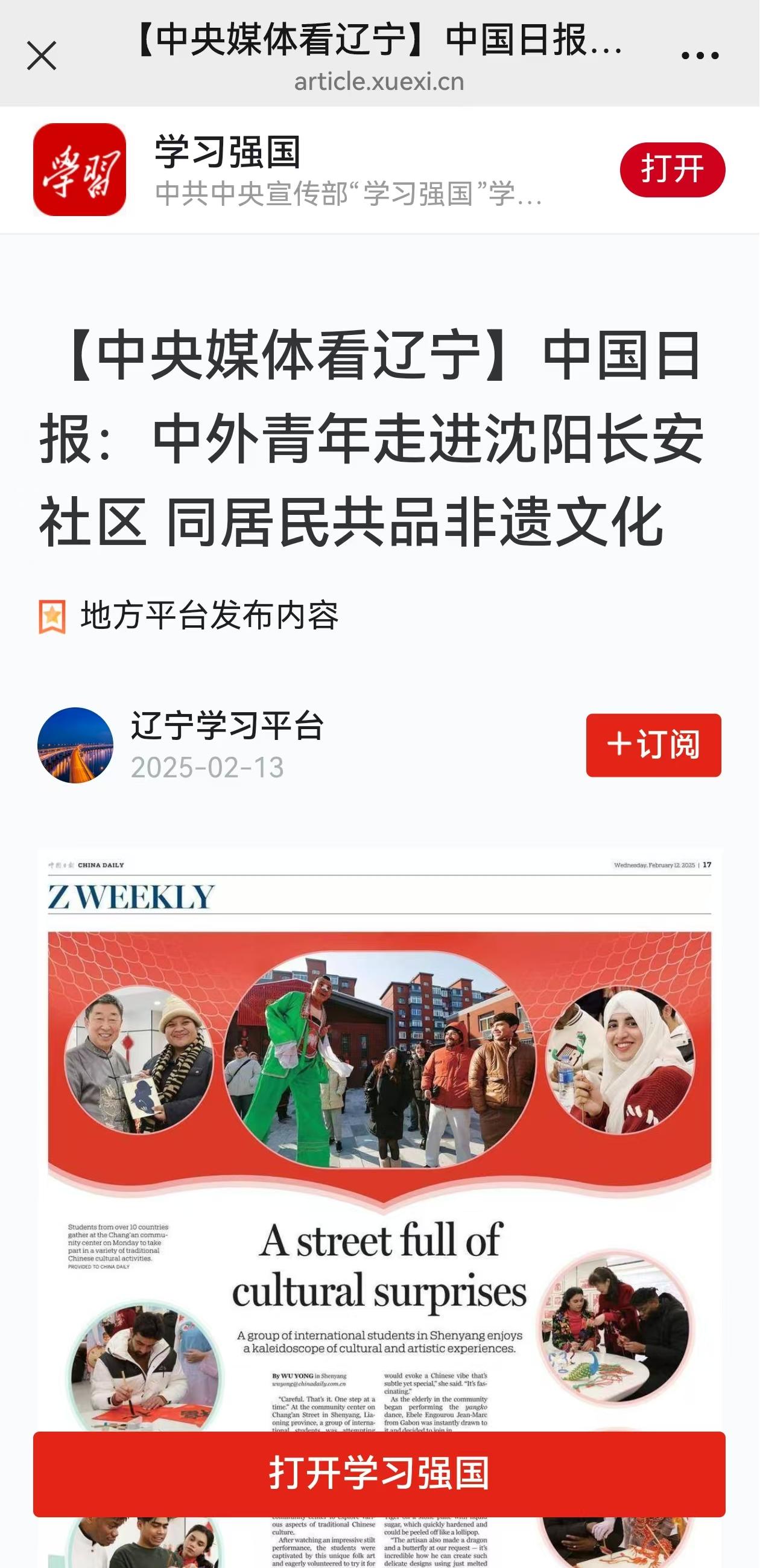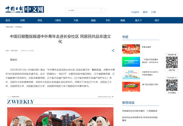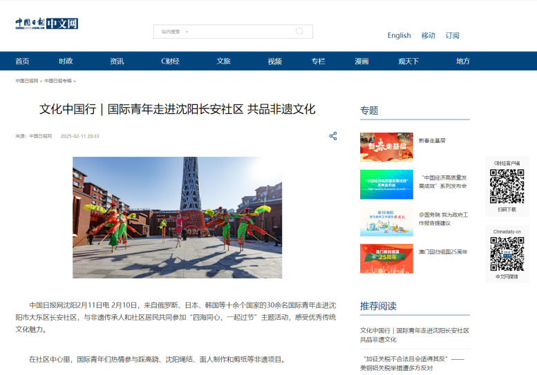 2月11日,beat365官网留学生在元宵节前夕走进沈阳长安社区,与居民共同体验非遗文化,自发地对外讲好中国故事,获得《中国日报》纸媒整版报道,并同步于中国日报中文网、China Daily客户端、中国日报官微、中国日报双语新闻视频号,还获学习强国辽宁学习平台、辽宁省教育厅公众号、中共沈阳市委宣传部公众号、中共沈阳市委台湾工作办公室公众号、中国共产主义青年团沈阳市大东区委员会公众号等媒体转载。
