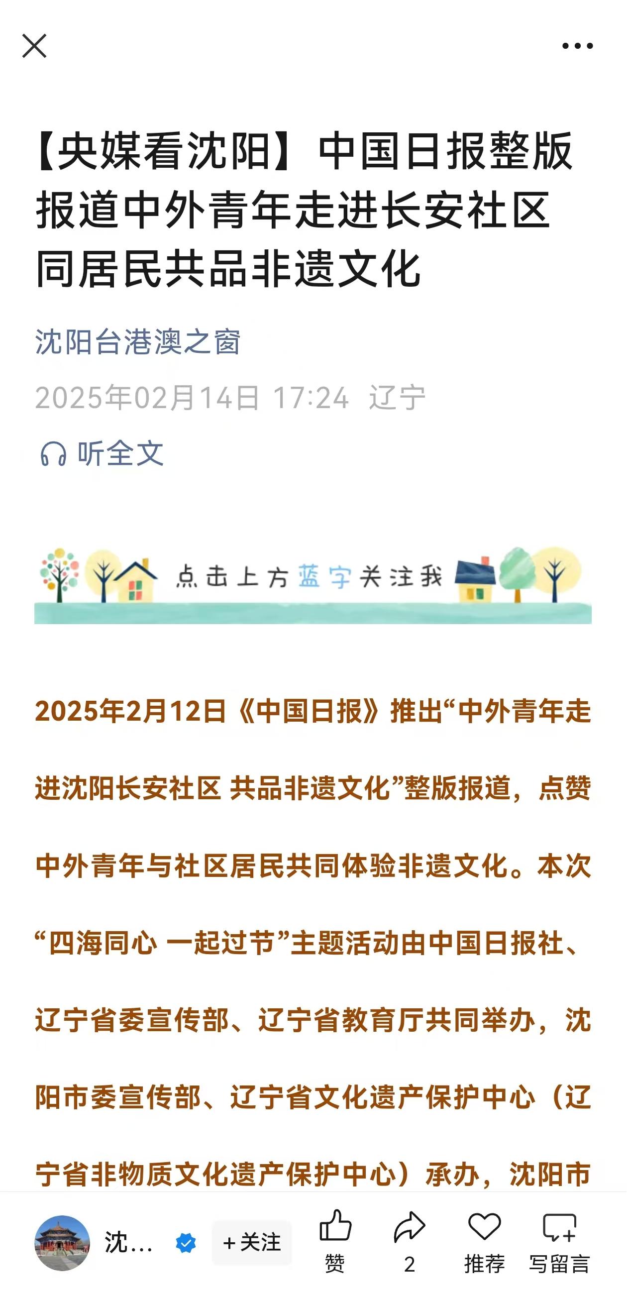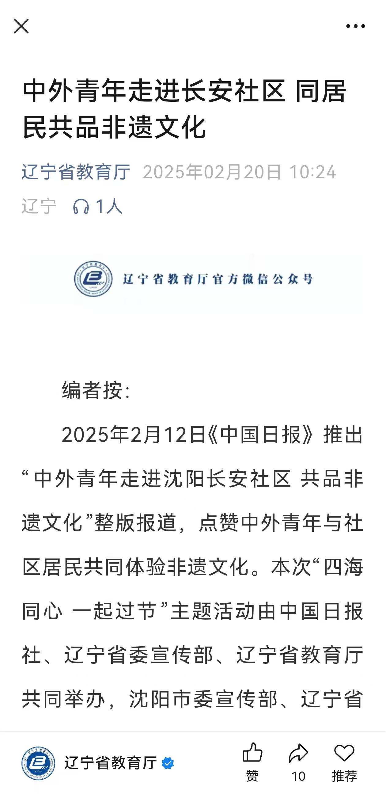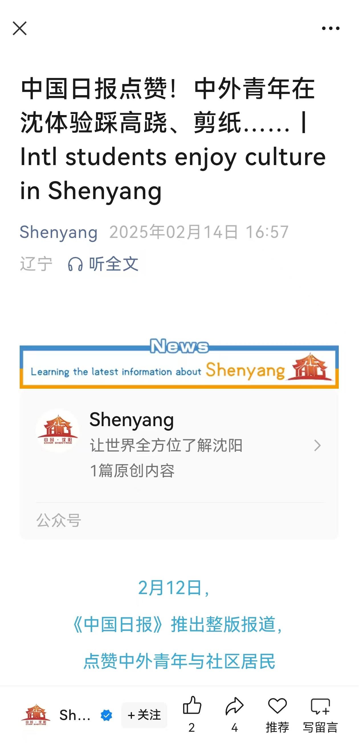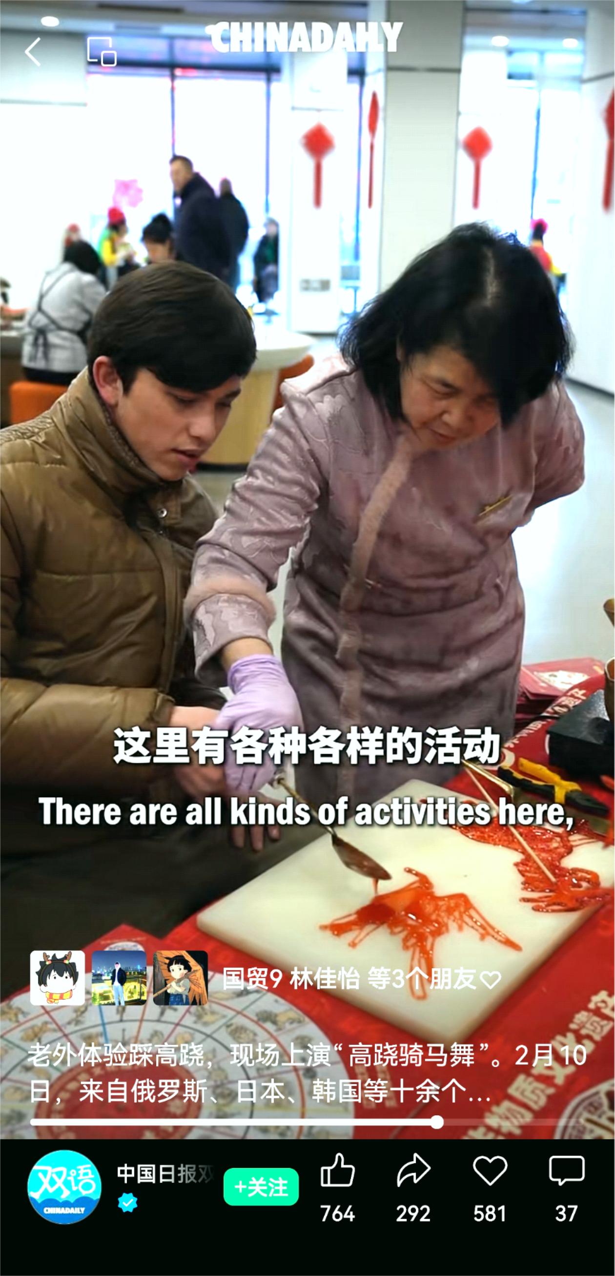 2月11日,beat365官网留学生在元宵节前夕走进沈阳长安社区,与居民共同体验非遗文化,自发地对外讲好中国故事,获得《中国日报》纸媒整版报道,并同步于中国日报中文网、China Daily客户端、中国日报官微、中国日报双语新闻视频号,还获学习强国辽宁学习平台、辽宁省教育厅公众号、中共沈阳市委宣传部公众号、中共沈阳市委台湾工作办公室公众号、中国共产主义青年团沈阳市大东区委员会公众号等媒体转载。