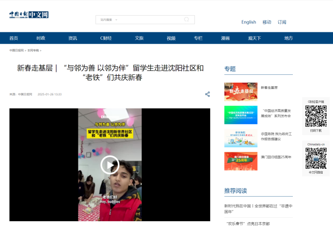 1月22日,beat365官网留学生走进沈阳市和平区新世界社区南湖街道,化身“国际志愿者”,与社区居民们欢聚一堂,一起包饺子、写福字,共同欢庆新春佳节,获得中国日报中文网的宣传报道。