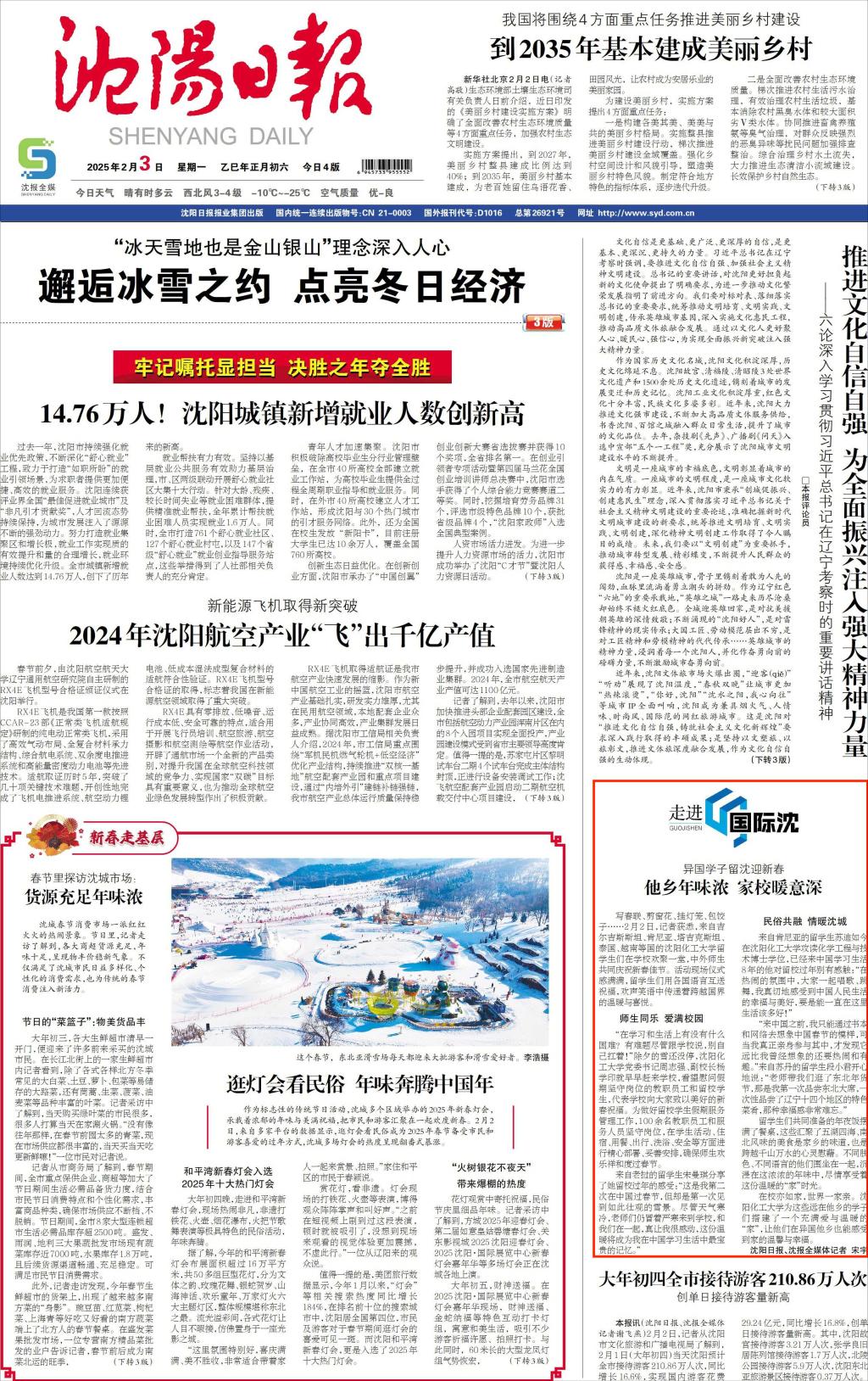 1月28日,校领导看望慰问春节期间在岗教职员工和留学生,获得《沈阳日报》头版报道,并同步推送至“沈阳发布”客户端。