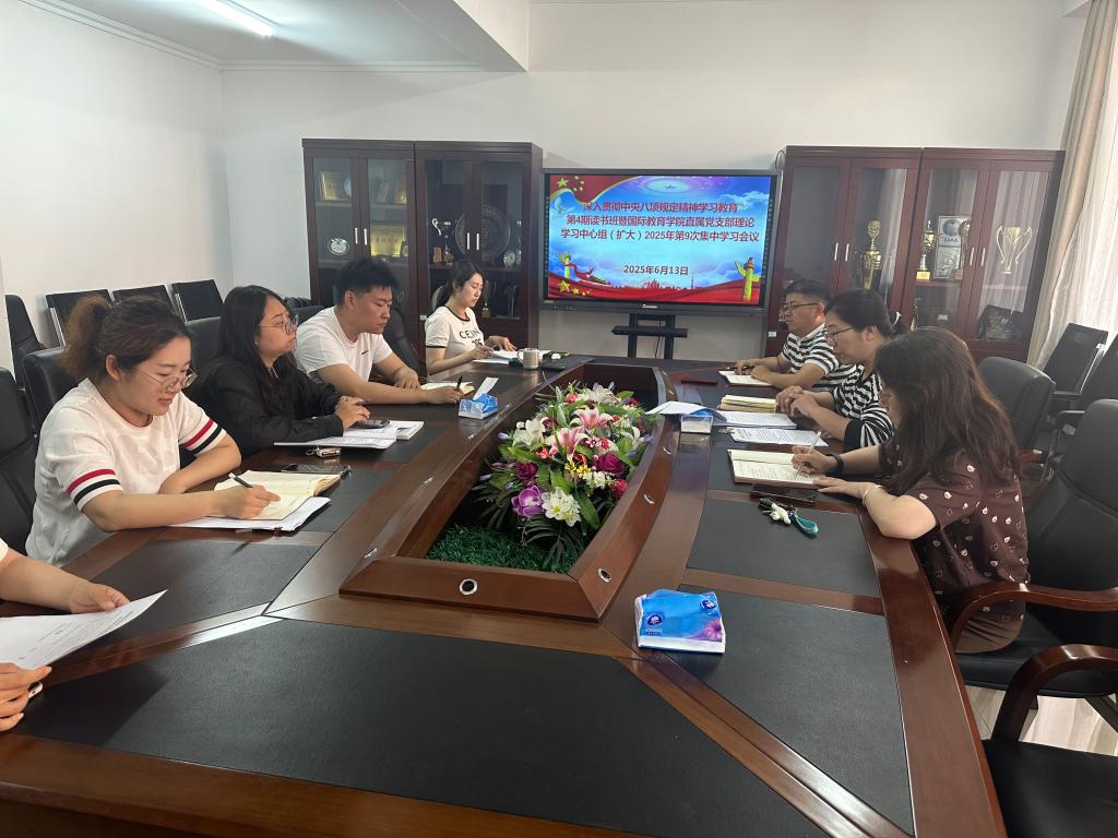 6月13日,国际教育学院直属党支部在学院会议室举行深入贯彻中央八项规定精神学习教育第4期读书班暨理论学习中心组(扩大)2025年度第9次集中学习会议。学院全体党员参加学习,国际教育学院直属党支部书记、院长王春雨主持会议。