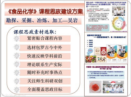 课上,《食品化学》课程负责人张卉老师以“水分活度与食品稳定性关系”章节为例,详细介绍了在专业课程教学过程中有机融入思政教育的过程。通过“问题(现象)提出-推理分析-理论解释-对策论证-应用拓展”环环相扣、层层递进的教学设计,使学生在教师的引导下主动参与小组任务、教师精讲、进阶讨论、头脑风暴等教学活动,一层层抽茧剥丝般找出并掌握核心知识点,并获得了利用理论知识分析解决实际案例问题的能力,学生也在此过程中不知不觉地增强了社会责任感和职业道德意识,认识到学好专业知识的重要性。
