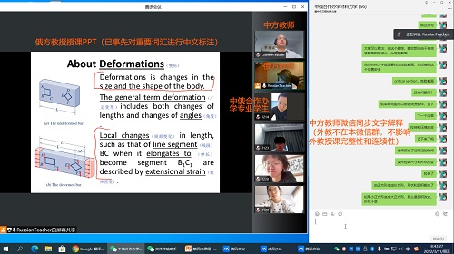 根据疫情期间“停课不停教,停课不停学”、“保证在线学习与线下课堂教学质量实质等效”的总体要求,机械与动力工程学院根据学校部署,引导教师积极采用多种现代信息手段保障在线授课质量。《材料力学》是机械与动力工程学院中俄合作办学能源与动力工程专业的核心课程,其授课采用了俄罗斯伊尔库茨克国家研究型技术大学PERELYGINA Aleksandra副教授和beat365官网苏勇副教授联合“同步课堂”教学模式,教学效果良好。