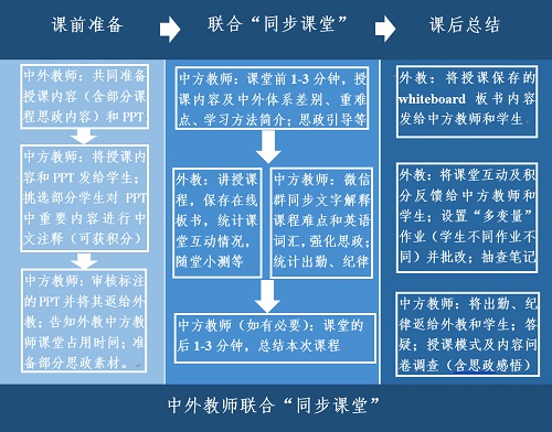 中外联合“同步课堂”教学模式打破了国内很多高校中外教师联合授课普遍采用的“中方和外方教师分阶段分别授课,各占总学时一定比例”的教学模式,而采用了“双方共同主持每一节课堂”的教学模式,解决了目前高等院校特别是普通高等院校中外合作办学项目普遍存在的培养具有国际视野的人才、对学生较高的英语要求以及教育部对外教课程学时和学分四个1/3比例的要求,与学生入学分数较低(很多学生学习能力较弱)、专业英语水平不高、中外课程体系差别以及疫情防控背景下外教线上远程授课导致学生在外教课堂学习困难之间的突出矛盾。