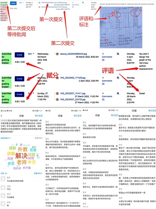 为了进一步提高教学模式的实施效果,苏勇副教授在联合“同步课堂”授课中经常通过学习通发放问卷,询问学生的学习困难,并不断调整教学方案,优化教学模式。2022年3月份,共发放4次调查问卷,对学生学习中存在的问题以及对教师授课的建议进行调查。