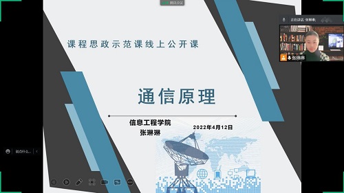 4月12日上午,校级课程思政示范课云端公开课第七讲《通信原理》正式开课。信息工程学院张琳琳老师以树立科技自信,构建交互式教学课堂”为题分享课程思政改革成果,该门课程是电子信息工程等专业的专业基础课,2020年被评为校级首批“课程思政示范课程”。张琳琳老师曾多次参加校级青年教师讲课大赛、课程思政能力大赛等教学比赛,并取得优异成绩。