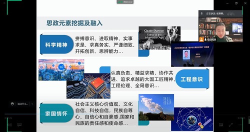 分享中,张老师以实际教学案例进行课程思政讲解,结合理论内容,引入通信技术新的科技发展成果。教学中以问题为导向,采用视频教学、案例教学等多种形式,通过线上+线下、课内+课外、灌输+启发等教学方式将思政教育潜移默化地融入到各个教学环节。课堂上从学生角度出发,设计师生交互过程教学内容,使学生实现由“乐学”“好学”到“会学”“学会”的转变,激发学生学习兴趣,精心设计各教学环节,渗透德育教育于学生内心。课下结合学生听课反馈,及时调整教学设计和内容,以促进教学目标有效达成。