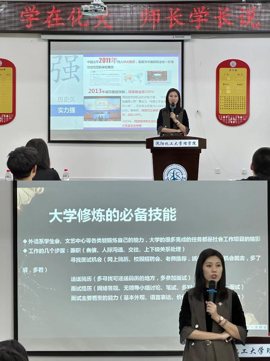 4月19日理学院邀请外国语学院2015届毕业生邢碧雪学姐举办第一场讲座,邢碧雪学姐为大家分享实习与工作经历,她强调不论是前期规划、日常积累甚至备考过程都十分重要。她告诉学弟学妹,大学期间要充分了解自己,找准定位,要把自己的长处发挥出来,坚持自己的梦想,砥砺前行。在互动交流环节,邢碧雪学姐积极回答同学们提出的关于学习、生活等方面的问题,同学们受益匪浅。
