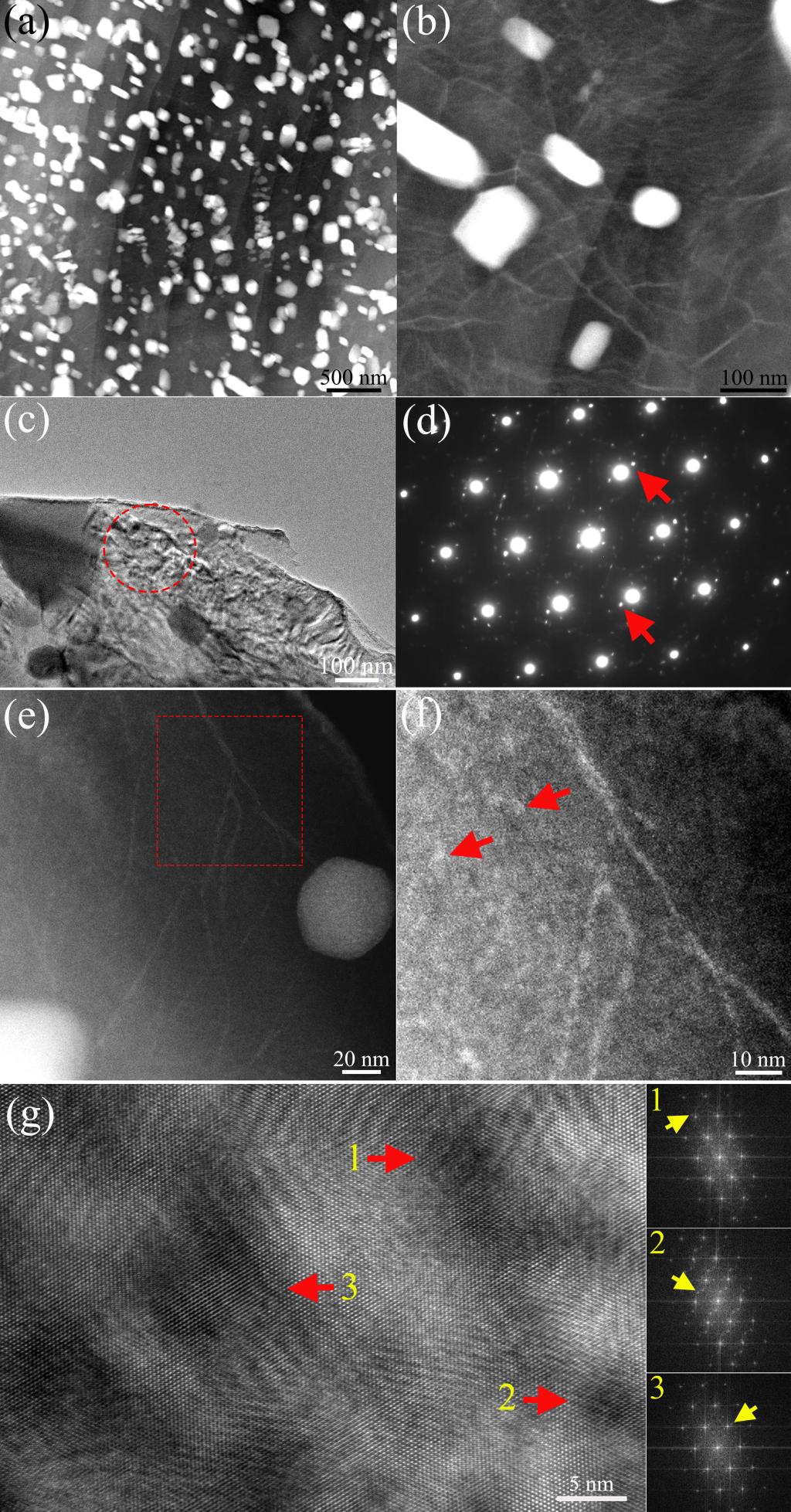 图5 轧制+时效合金的TEM图:(a) 高密度动态沉淀的HAADF图;(b) 更多位错界面的进一步放大HAADF图;(c) 动态沉淀和基体的微观组织;(d) 图(c)中红色圆圈区域基体的电子衍射花样,电子束沿[0001]α-Mg晶带轴入射;(e) 图(c)中红色圆圈区域微观组织的HAADF图;(f) 图(e)中矩形框区域微观组织的进一步放大图;(g) 包含多个纳米团簇的HRTEM图以及相应的FFT