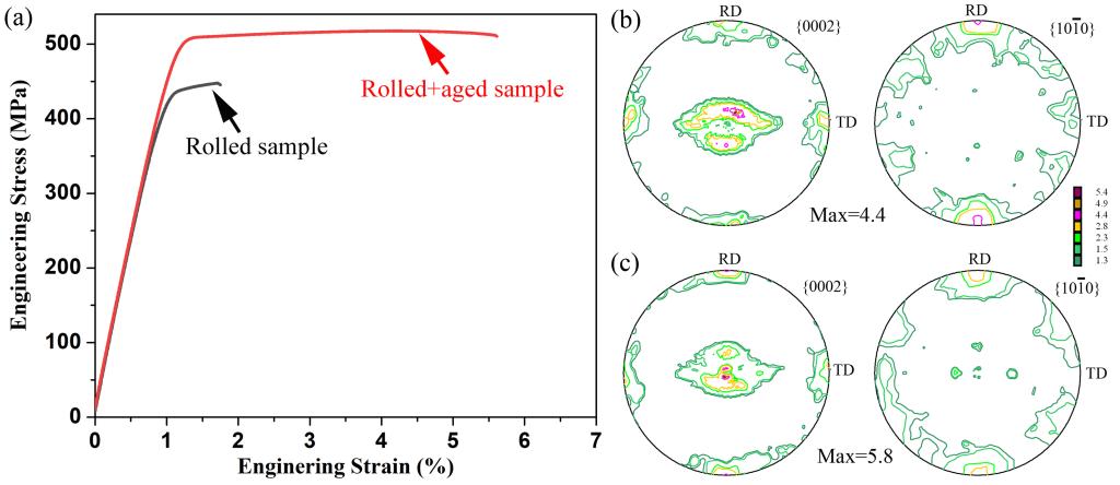图3 轧制和时效Mg-15Gd合金的力学性能和宏观织构:(a) 工程拉伸应力-应变曲线,(b) 轧制态合金织构,(c) 轧制+时效态合金织构