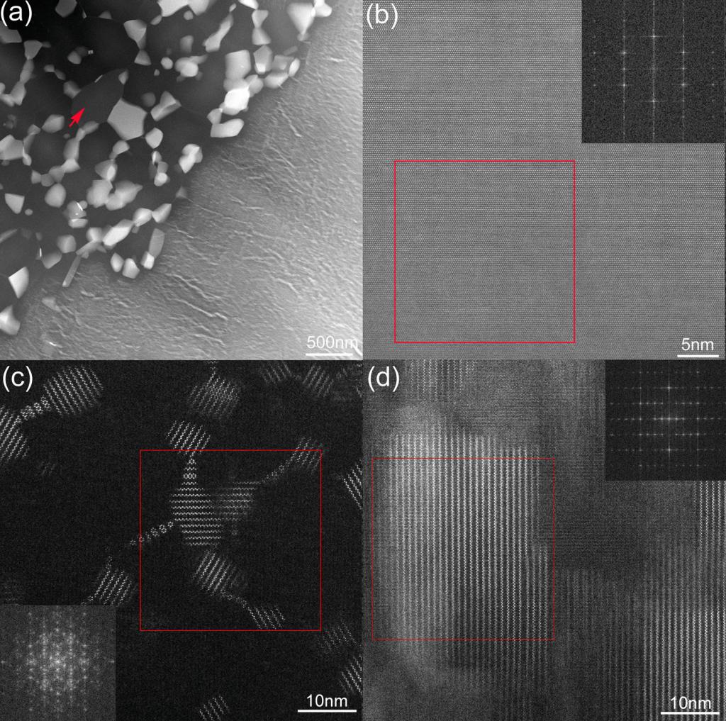 图2 峰值时效样品的TEM图:(a) 动态再结晶晶粒和拉长晶粒内的沉淀析出微观组织的HAADF图;(b) 图(a)中红色箭头指向处动态再结晶晶粒内微观组织的高倍HAADF图,内插图为矩形框区域的FFT,电子束沿[11-20]α-Mg晶带轴入射;(c) 沿[0001]α-Mg方向观察到的拉长晶粒内柱面沉淀的HAADF图,以及相应矩形框区域的FFT;(d) 沿[11-20]α-Mg方向观察的拉长晶粒内柱面沉淀的HAADF图,以及相应矩形框区域的FFT