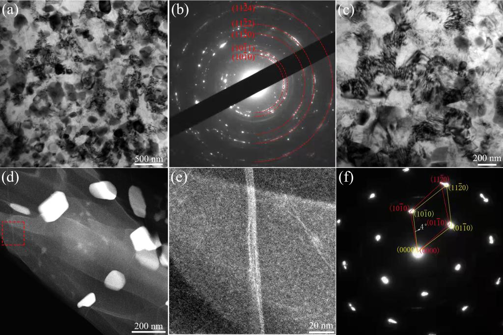 图4 轧制态合金的TEM图像:(a) 包含高密度动态沉淀和纳米晶粒的微观组织;(b) 图(a)相应的电子衍射花样;(c) 高密度位错的微观组织;(d) 进一步放大的微观组织的HAADF图;(e) 图(d)中红色矩形框区域的高倍HAADF图;(f) 图(e)中小角度晶界相应的电子衍射花样