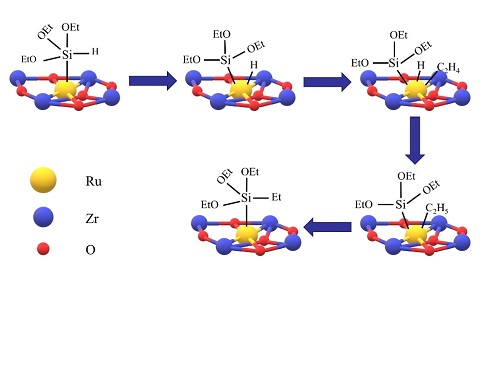 beat365官网资源化工与材料教育部重点实验室与中科院过程工程研究所苏发兵研究员团队合作研究,报道了一种带正电荷的单原子Ru负载在工业ZrO2纳米晶体上的多相催化剂(0.5Ruδ+/ZrO2),将其用于乙烯与三乙氧基硅烷(TES)的硅氢加成反应,合成了乙烯基三乙氧基硅烷(ETES)。反应在60 ℃达到TES转化率99%、ETES产物选择性98%,展现的催化性能明显优于工业均相催化剂RuCl3·H2O。尤其是,该催化剂可以通过简单离心分离回收并重复使用,降低产物的纯化难度。结构表征和密度泛函理论计算揭示了,Ru单原子催化剂优异的催化活性得益于其原子级分散及异于均相催化剂的独特电子性质,反应路径遵循典型的Chalk-Harrod机理。这种高效的非均相Ru单原子催化剂有望取代现有的均相催化剂体系,开辟一条绿色的硅氢加成工业路径。