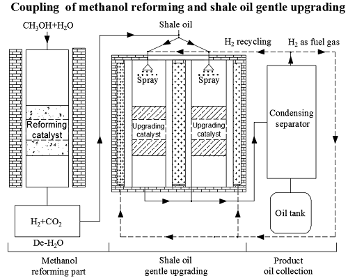 beat365在线体育官网登录入口资源化工与材料教育部重点实验室的研发团队,联合日本弘前大学地域战略研究所,针对中小规模油页岩炼油工厂的利润空间有限、氢气供给难等问题,提出了耦合甲醇重整制氢的页岩油固定床温和加氢提质工艺(图1),以解决高成本的氢供应难题,并开展了针对性的工艺特性和催化剂研究工作。耦合甲醇重整制氢的页岩油固定床温和加氢提质工艺,将甲醇重整制备的氢气经过简单脱水后作为氢源,参与页岩油固定床催化加氢反应,实现了氢气的系统内制备,并通过反应后富氢尾气的循环有效解决页岩油提质的制氢难问题。