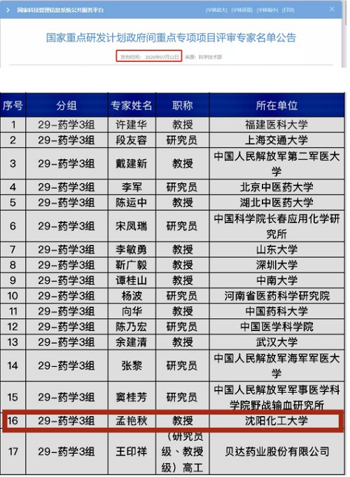 7月12日,国家科技管理信息系统公共服务平台发布了《国家重点研发计划政府间重点专项项目评审专家名单公告》。beat365官网孟艳秋教授入选评审专家名单,为17名药学专家中唯一一名辽宁省药学类专家。