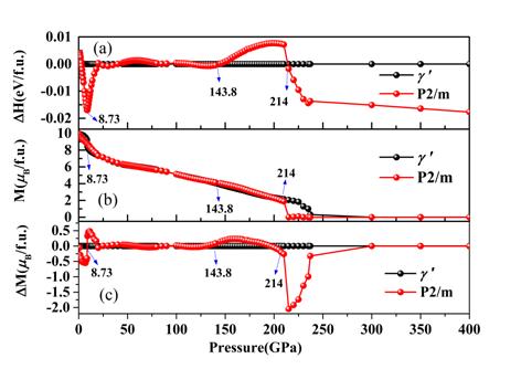 图3.(a)P2/m结构的Fe4N相对于γˊ结构的Fe4N焓差随压力的变化。(b)P2/m结构的Fe4N与< width="48" height="21" word_img="file:///C:/Users/ADMINI~1/AppData/Local/Temp/msohtmlclip1/01/clip_image004.png" vsbhref="vurl" vheight="21" vwidth="48" style="background:url() no-repeat center center;border:1px solid #ddd"/>结构的Fe4N的磁矩随压力的变化。