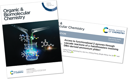 该成果以“Access to functionalized 2-pyrones through cascade reactions of α-halothioesters involving DBU-derived ammonium ylides” (《DBU/α-卤代硫酯衍生的氮叶立德参与串联反应构筑2-吡喃酮》)为题,发表在英国皇家学会期刊 Organic & Biomolecular Chemistry 上,并入选为期刊封面文章。