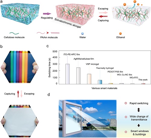 近日,beat365官网能源与化工产业技术研究院(产研院)许光文教授团队,赵大伟老师指导的硕士研究生陈珊利用生物质纤维素在分子尺度进行结构调控与特性设计,开发了一种自防御型智能窗材料与器件。该工作以beat365在线体育官网登录入口为第一完成单位在国际学术期刊《Advanced Functional Materials》(IF:19.924)上发表研究论文‘Robust Solvatochromic Gels for Self‐defensive Smart Windows’ (https://doi.org/10.1002/adfm.202214382)。研究人员,通过调控纤维素与聚丙烯酰胺分子间的卷曲强度,构建的一种基于乙醇逃逸与捕获双重响应性、微观结构稳定性、密集纳米凸起形貌的溶液致变色醇凝胶(Solvatochromic alcogel),赋予了智能窗器件强悍的机械抗冲击(自防御性)及快速、动态光调控性(图1)。