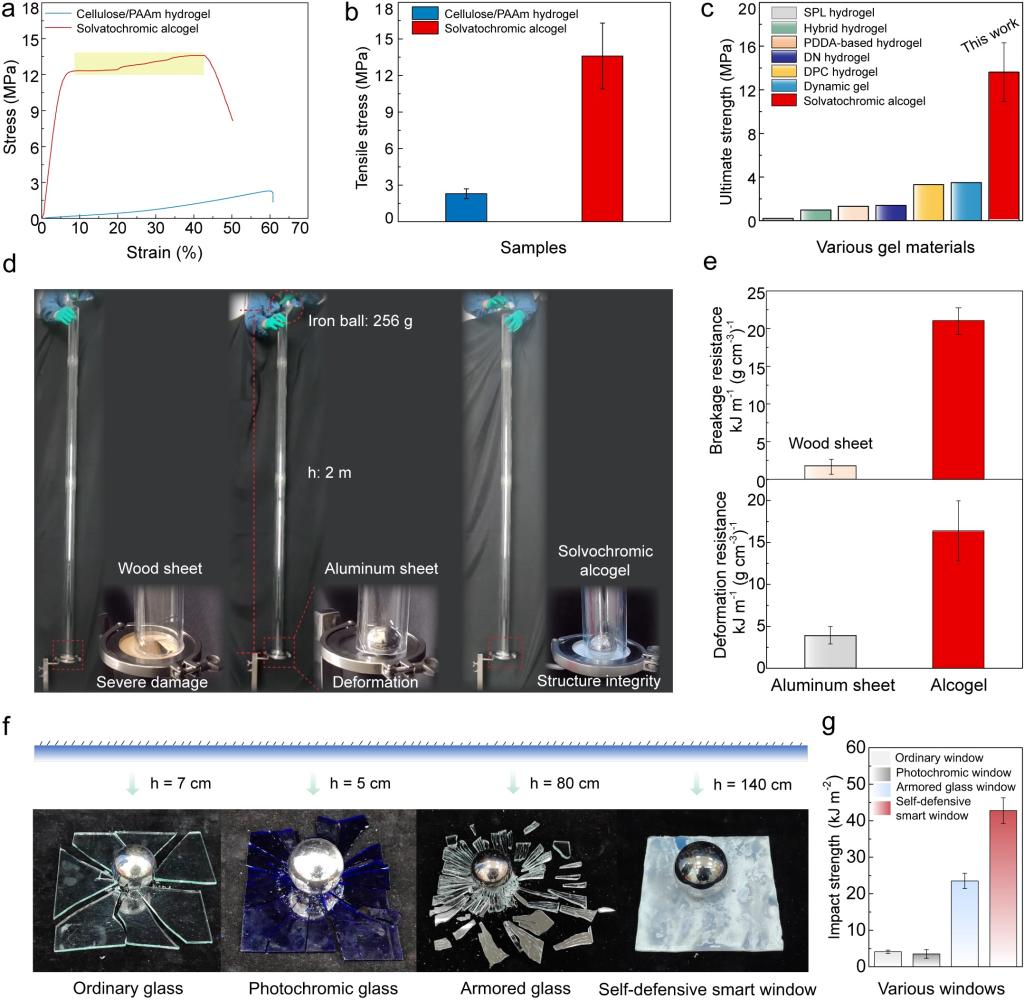 该醇凝胶表现出快速响应的光管理行为,透光率可在85%-5%内动态切换,切换时间仅为8s,即使经历超过180次的循环光调控行为,该凝胶依然具有良好的响应速度与光性能稳定性。与此同时,溶液致变色醇凝胶拥有强悍的力学性能,其抗拉伸强度、弹性模量、比抗冲击强度,分别达到13.65 MPa、60.6 MPa及42.8 kJ m−2(图2),优于传统功能凝胶、玻璃、钢化玻璃与商用智能玻璃等材料。