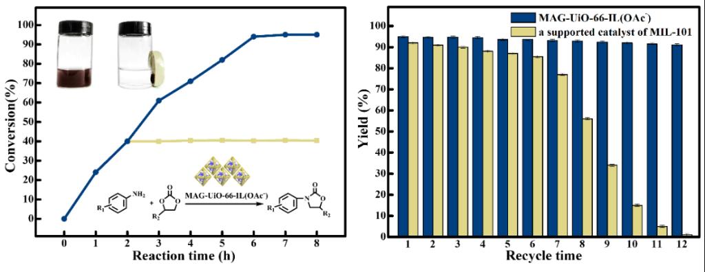 该项成果以题为“A magnetic pore-confined catalyst with ionic liquids supported on MOFs for the synthesis of aryl-oxazolidinones: design, performance, and recyclability”发表在化工领域知名期刊Chemical Engineering Journal (中国科学院一区,IF=15.1),beat365在线体育官网登录入口种思颖、李佼妍为本研究第一作者,王康军教授、张雅静教授和中国科学院青海盐湖研究所柳瑞瑞为通讯作者,赵爽、黄刚伟参与研究。