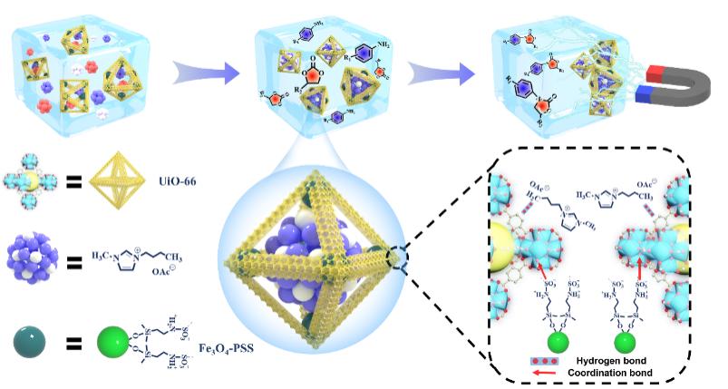 图1. 磁性MOF限域催化剂MAG-UiO-66-IL(OAc)设计图