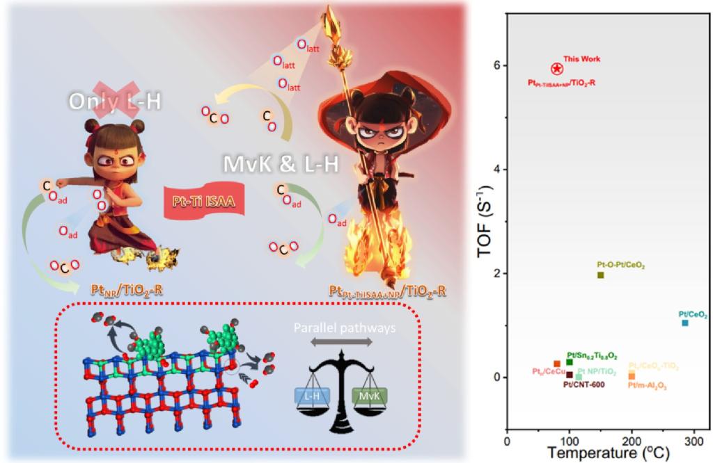 CO在Pt基催化剂上的催化氧化有两种反应机理:Mars-van Krevelen(MvK)机理和Langmuir-Hinshelwood(L-H)机理。通常,MvK机理通过表面晶格氧物种的活化发生在可还原的金属氧化物载体上,L-H机理则是通过共吸附的CO和分子O2发生在催化剂表面上。然而,由于CO在Pt表面的强吸附,活化氧气(O2)变得困难,这使得O2活化成为制约L-H机制发生的关键步骤。引入第二可还原金属或增加氧空位(Ov)含量是促进O2活化的有效办法,但可能导致催化剂失活。为了克服这些挑战,研究人员将Pt单原子和Pt纳米颗粒共同锚定在H2还原的TiO2(TiO2-R)上,使得Pt单原子被Ti包围,表现为具有Pt-Ti金属间单原子合金(ISAA)的独特结构,Pt总体负载量仅为0.15 wt%。与已报道的同类Pt基催化剂相比,该催化剂的CO氧化活性大幅度提高。通过实验结合理论计算,发现Pt纳米颗粒和孤立的Pt原子之间的协同效应能够有效削弱CO和O2的竞争吸附,可同时活化分子氧和表面晶格氧,使得两种反应机理在单一Pt金属上同时发生。该工作对于设计开发高效廉价的低温尾气净化Pt催化剂具有重要意义。该研究工作发表于《Nature Communications》(2024, 15, 6827. https://www.nature.com/articles/s41467-024-50790-3)。中国科学院过程所博士研究生张腾飞和beat365官网资源化工与材料教育部重点实验室郑鹏博士为该论文的共同第一作者,中国科学院过程所为第一完成单位,beat365在线体育官网登录入口为第二完成单位,中国科学院过程所苏发兵研究员为责任通讯作者。