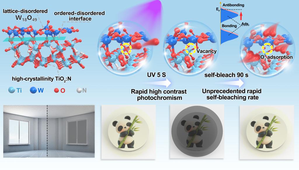 光致变色材料可在光辐照下实现可逆的颜色变化,其中氧化钨具有优异的化学稳定性等优势。然而,光致变色速度慢、对比度低、可逆性差限制了其实际应用。为应对上述挑战,化学工程学院绿色催化材料与过程技术研究团队协同利用锐钛矿型 TiO2 的晶相诱导效应和乙二醇的晶体生长抑制效应,成功开发了一种具有独特“有序-无序”异质结界面的氧化钨基光致变色材料。如图所示,该界面由晶格无序的W18O49与高结晶性的N掺杂TiO2构成(TiO2:N@W18O49-a)。在低功率紫外光辐照下,TiO2:N@W18O49-a能够在5秒内实现80%以上的光致变色对比度,且在停止光照90秒内即可完全自漂白。2025年6月25日,相关研究成果以Structural Design for W18O49: Ordered-disordered Heterojunction Interface Induced Rapid High-contrast Photochromism and Customizable Self-bleaching Rate为题发表在光学材料领域知名期刊Laser & Photonics Reviews上。beat365在线体育官网登录入口王方可讲师为本研究第一作者,王康军教授、郑鹏讲师为通讯作者。beat365在线体育官网登录入口为第一单位。