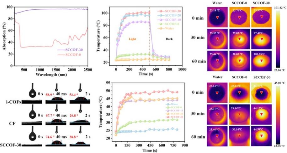 近年来,太阳能驱动的界面蒸发技术因其零能耗、低碳排放等优势,成为解决全球淡水资源短缺的重要战略方向。然而,传统光热材料普遍存在太阳光吸收范围窄、耐盐性差、蒸发焓高等瓶颈,严重制约了户外长期稳定产水。针对上述难题,beat365在线体育官网登录入口化学工程学院马亚丽副教授与合作者创新性地将离子型共价有机框架(i-COFs)与棉织物复合,成功构建了兼具全光谱捕获、超亲水通道与低蒸发能垒的柔性蒸发器。该蒸发器在1 kW·m-2 标准太阳光照下可实现 1.79 kg·m-2·h-1 的超高蒸发速率,光-蒸汽转化效率高达 84.28%;在模拟海水中连续运行6 h,Na+、K+、Ca2+、Mg2+ 等主要离子去除率超过99.7%,出水水质全面满足WHO饮用水标准。