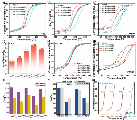 研究发现单原子Co的加入,通过部分取代OMS-2晶格中的K和Mn位点,改变了Mn的配位环境,削弱了Mn-O键,从而调节了Mn4+比例及低温可还原性。同时,Co掺杂显著提升了晶格氧的浓度与迁移率,这对实现VOCs的深度氧化至关重要。此外,单原子钴促进了光致活性氧物种(如·OH、1O2和O2-)的生成,加速了电子传递和氧物种的光诱导活化,从而大幅提升催化剂的催化活性。具体来说(下图),2.8 wt.% Co/OMS-2催化剂表现出最佳性能:在光热催化(PATCO)条件下,甲苯的T90(达到90%转化率的温度)仅为170 °C,相较于热催化(TCO)降低了65 °C;丙酮的T90为129 °C,显著低于其他催化剂。此外,在甲苯-丙酮混合体系中,该催化剂展现出优异的协同效应,甲苯T90 = 164 °C,丙酮T90 = 107 °C。这表明,单原子钴掺杂不仅显著提升了催化剂的低温活性,还有效克服了混合VOCs体系中常见的相互抑制问题,为复杂VOCs的高效治理提供了有力支持。
