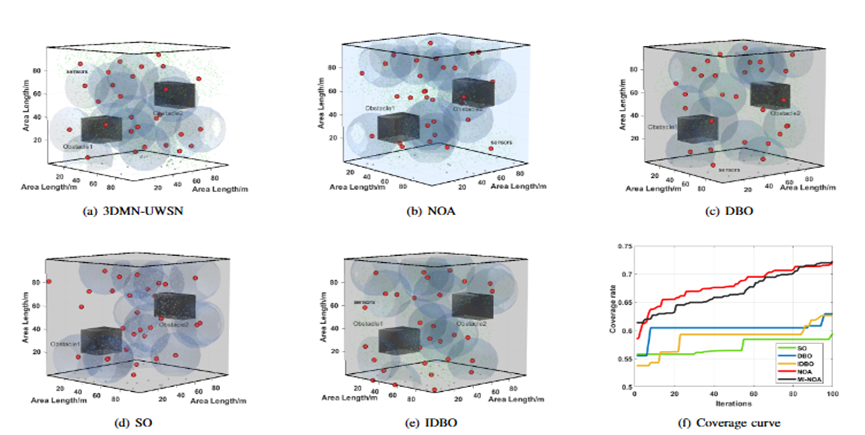 无线传感器网络在复杂水下三维环境部署过程中,受水流、压力、信号衰减等多重因素影响,传统部署方法往往难以实现高效、稳定的网络覆盖,成为制约水下监测、探测与通信应用的关键瓶颈。针对该关键问题,王军教授团队采用智能优化算法作为优化工具,通过改进种群初始化策略,搜索角度,搜索轨迹等方面,提出了一种多策略改进的星鸦优化算法(MI-NOA),通过与13种算法在CEC-2022测试集的对比,验证了MI-NOA的性能。此外,根据算法特性,将目标函数灵活设计为求解最小化问题。在应用场景方面,构建了无障碍以及双障碍两种场景。通过一系列对比实验证明,该方法能够对目标空间实现较为全面的覆盖效果,明显优于对比算法,此外,该算法的覆盖速度快,覆盖效率高,能够在较短时间内完成对目标空间的高质量覆盖。同时,该方法在复杂空间内(如障碍物等)也具有较好的鲁棒性。