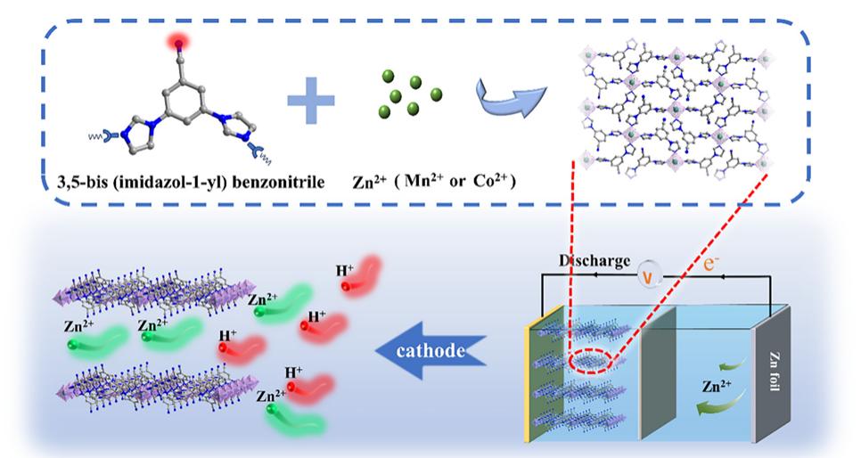 水系锌离子电池(AZIBs)作为一种新兴的储能技术,相较于传统锂离子电池,具备本征安全性高、成本效益突出以及环境友好等显著优势。然而,其实际应用受到缺乏高容量、长循环寿命与高性能正极材料的制约。为此,本研究提出了一种创新的分子设计策略,采用氰基功能化的二维配位聚合物(2D M-BLB)作为AZIBs正极材料。通过将3,5-双(咪唑-1-基)苯甲腈配体与过渡金属离子(Zn²⁺、Mn²⁺、Co²⁺)配位,构建了具有起伏层状结构的二维材料,该结构不仅为Zn²⁺的快速扩散提供了开放通道,还暴露出丰富的活性位点。氰基的高电负性与多电子氧化还原能力协同作用,赋予M-BLB优异的循环稳定性与高比容量。