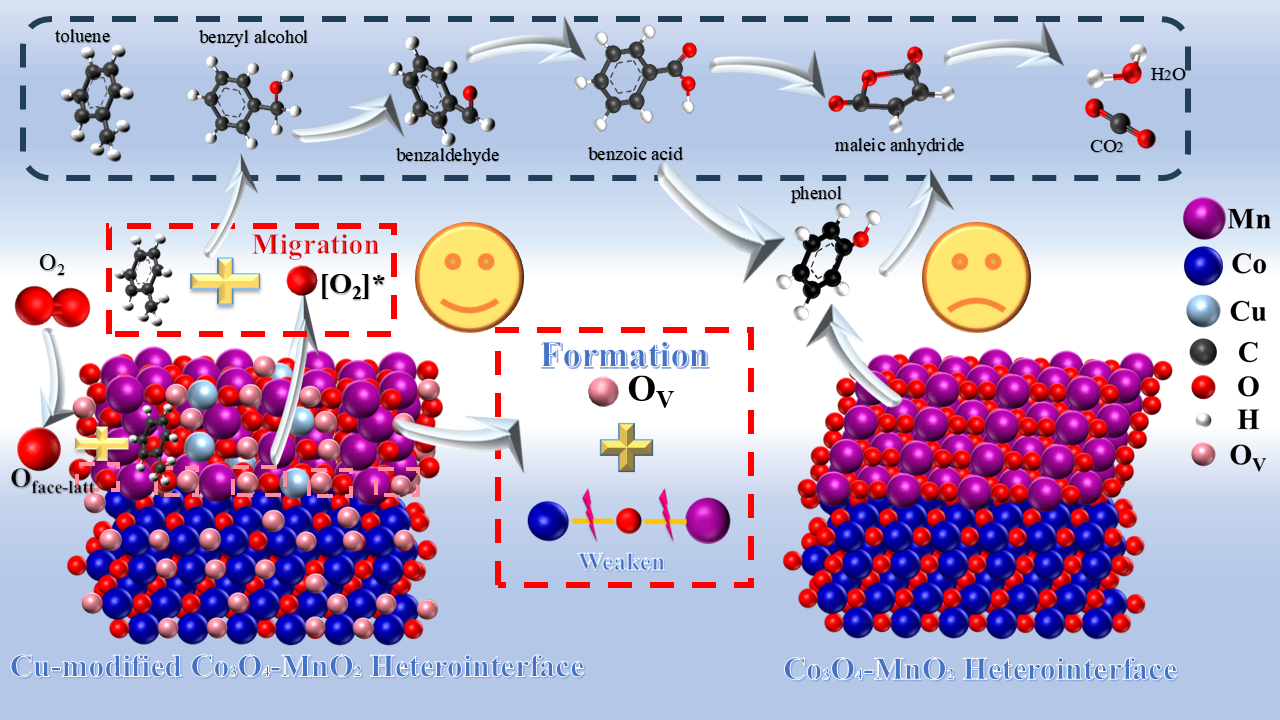 图 Cu修饰的Co3O4-MnO2界面增强甲苯催化氧化的机理
