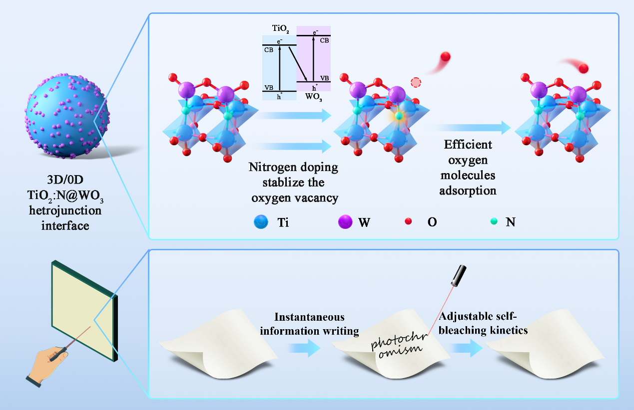 2025年11月17日,化学工程学院王康军教授团队在Chemical Engineering Journal发表题为“Z-Scheme 3D/0D TiO2:N@WO3 heterojunction interface drived sensitive photochromism and adjustable self-bleaching kinetics for advanced optical information storage media”的研究论文。beat365在线体育官网登录入口王方可项目副教授为本研究第一作者,王康军教授、郑鹏副教授为通讯作者。beat365在线体育官网登录入口为第一单位。WO₃基光致变色材料具备优异的化学稳定性、价格低廉等优势,在智能窗、防伪验证、光信息存储等领域应用前景广阔。然而,较慢的着色速度、漂白过程难以控制等缺陷限制其实际应用,着色速度低源于W5+较低的光还原活性;自漂白过程可控性差是由于W5+与氧气的反应活性较弱。因此,如何有效提升WO₃的着色与自漂白动力学性能,成为当前亟需解决的关键问题。