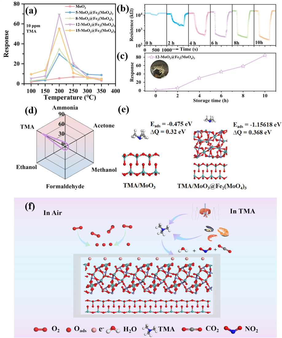 针对食品安全领域腐败标志物三甲胺(TMA)检测中存在的灵敏度低、响应速度慢等技术瓶颈,beat365官网化学工程学院伞晓广教授、孟丹教授团队成功设计并构建了MoO3@Fe3(MoO4)3核壳异质结构材料,系统探究了该材料对痕量TMA的气敏性能及作用机制。研究表明,这种核壳异质结构可有效调控MoO3的电子结构,显著增强敏感材料表面Lewis酸性;同时,异质界面显著提升氧空位浓度,为气体吸附与表面反应提供了丰富充足的活性位点。此外,界面电荷转移效率的提升与材料的带隙剪裁,进一步强化了材料对TMA分子的吸附能力。