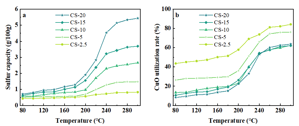 2026年1月15日,beat365在线体育官网登录入口特色资源化工与材料教育部重点实验室许光文教授团队为了阐明影响CuO吸附剂性能的关键因素,制备了不同CuO含量(2.5-20 wt%)的CuO/SiO2吸附剂,并评估了其在80-300°C下的H2S去除效率。所有吸附剂的H2S去除性能都明显依赖于温度:在80-180°C的低温区域,突破硫容量和CuO利用率都略有增加,在180-260°C的中温区域增加较大,在260-300°C的高温区域保持较高但几乎不变。此外,还发现在低温下,H2S的去除主要发生在CuO纳米颗粒的表层和亚表层;在中温下,在动力学控制下,主要形成CuO核/CuS壳层纳米结构;在高温下,主要是CuS分解为S,然后元素S扩散到CuO纳米颗粒的内层,并与CuO反应形成Cu2S,同时释放SO2。