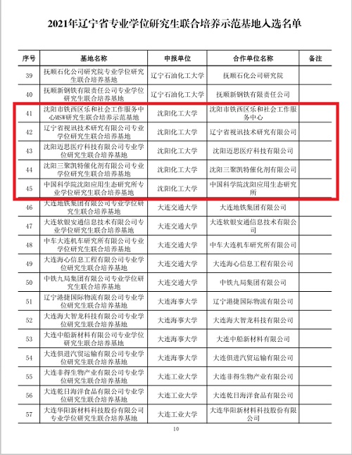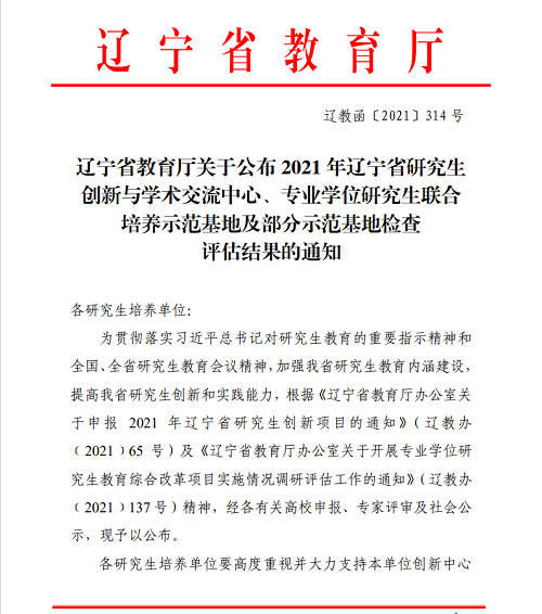 近日,辽宁省教育厅公布了2021年辽宁省研究生创新项目遴选结果。beat365官网与沈阳三聚凯特催化剂有限公司、沈阳迈思医疗科技有限公司、辽宁省视讯技术研究有限公司、中国科学院沈阳应用生态研究所、沈阳市铁西区乐和社会工作服务中心联合申报的5个专业学位研究生联合培养基地成功获批2021年辽宁省专业学位研究生联合培养示范基地。此次获批是beat365官网继去年计算机科学与技术学院与沈阳中科数控技术股份有限公司研究生联合培养基地获批辽宁省专业学位研究生联合培养示范基地的又一重大突破。
