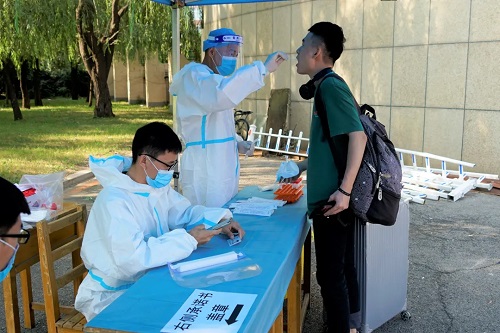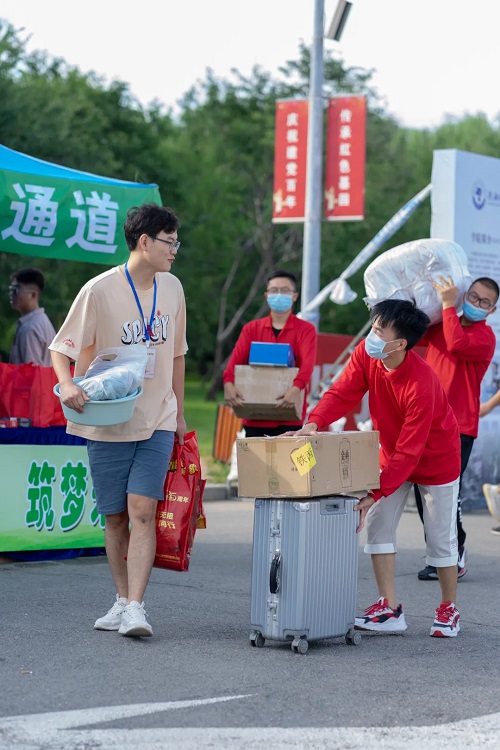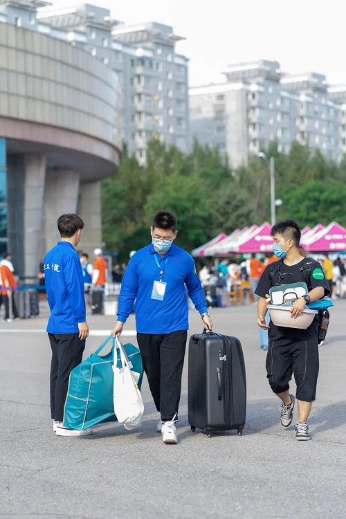 学校在报到口设置了等待区、核酸检测区、测温验证区、临时隔离区,新生在工作人员的引导下有序排队,凭核酸检测报告、入学通知书、身份证、辽事通健康码等,经过测温无异常后进入校园。