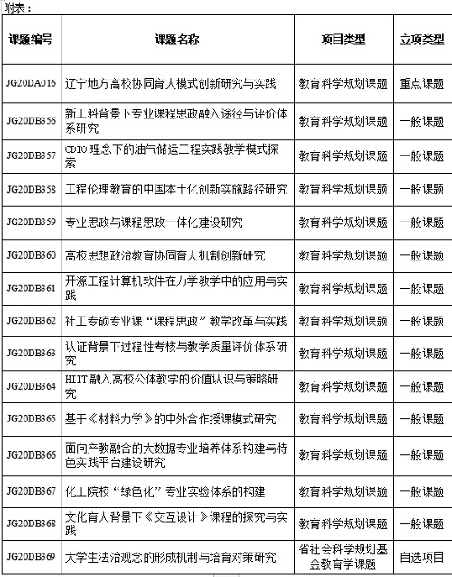 日前,辽宁省教育科学规划领导小组办公室通知公布省教育科学规划立项课题评选结果(辽教科规办字[2021]4号),beat365官网15个项目获得省教育科学规划课题立项,其中重点课题1项、一般课题13项、教育学自选课题1项(名单见附表)。beat365官网此次规划课题立项项目的数量位居我省高校前列,保持了学校近年来教改研究的良好态势,也展现了教育教学改革工作的新思路和新成果。
