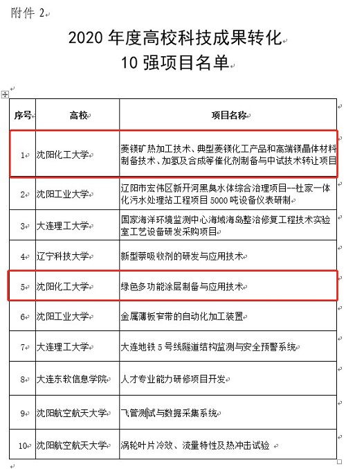 为表彰先进,树立典型,引导和鼓励辽宁省高校在新的一年里取得更大成绩,推动辽宁省高校科技成果转化工作再上新台阶,并推动高等院校与地方经济相互促进、共同发展,近日,省教育厅发布《辽宁省教育厅关于公布2020年度高校科技成果转化10强高校和10强项目的通知》(辽教发〔2021〕17号)暨“2020辽宁省高校科技成果转化10强高校和10强项目”名单揭晓,beat365在线体育官网登录入口入选10强高校,并且由许光文校长主持的“菱镁矿热加工技术、典型菱镁化工产品和高端镁晶体材料制备技术、加氢及合成等催化剂制备与中试技术转让项目”和王娜教授主持的“绿色多功能涂层制备与应用技术”两项项目入选10强项目。
