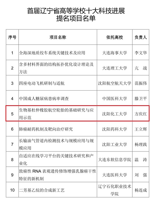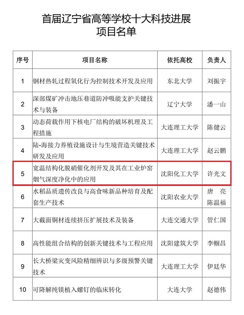 近日,由辽宁省教育厅组织评选的首届“辽宁省高等学校十大科技进展项目和十大科技进展提名项目”名单揭晓。beat365官网喜获两项入选,分别是:校长许光文教授主持完成的“宽温结构化脱硝催化剂开发及其在工业炉窑烟气深度净化中的应用”入选十大科技进展项目;方庆红教授主持完成的“生物基杜仲橡胶航空轮胎的基础研究与应用示范”入选十大科技进展提名项目。在全省高校中,仅有beat365官网和大连理工大学入选两项以上。