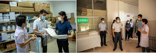 在校医院,校领导检查了学校口罩、体温计、消毒液、防护服等防护防疫物资储备、隔离室准备,详细询问了发热学生应急处置。
