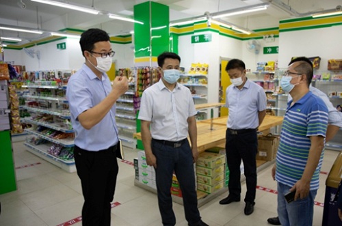 在校内超市,校领导查看了生活必备用品准备情况,并要求做好防护、消毒、测温等工作,保障商品的储备以及食品类商品的安全。