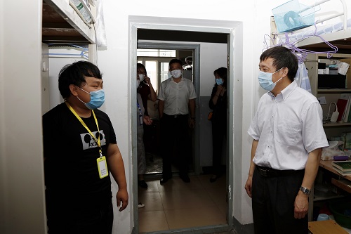 党委书记王强、纪委书记孟宪梅一行首先来到学校南门,慰问了坚守在一线的安全保卫人员和校医护人员。王强书记详细询问了学生返校入校流程以及出入登记情况,并嘱咐大家要继续保持良好的工作和精神状态,确保毕业生能够安全返校、顺利毕业。随后,王强书记一行走访了校园内的所有宿舍楼,看望了返校毕业生和师生志愿者。在宿舍报到处,王强书记查看了返校毕业生的报道情况和学校精心为毕业生准备的“爱心大礼包”,慰问了各学院、机关部门的师生志愿者们,向大家表达了感谢和致敬。在走访宿舍中,王强书记与省内返校毕业生亲切交谈,与省外毕业生现场连线,详细了解了大家居家学习、考研就业的情况。他向毕业生们表达了想念之情,并嘱咐毕业生放心,老师们会将行李安全寄送回家,学校也会尽力为每位毕业生提供完善的毕业服务,为大家顺利毕业保驾护航。同时,他期望,毕业生们能够在与学校共同抗疫的过程中体悟到对生命的敬畏,懂得逆行的担当,扛起家国的责任,共同为实现“化大梦”和“中国梦”贡献力量。