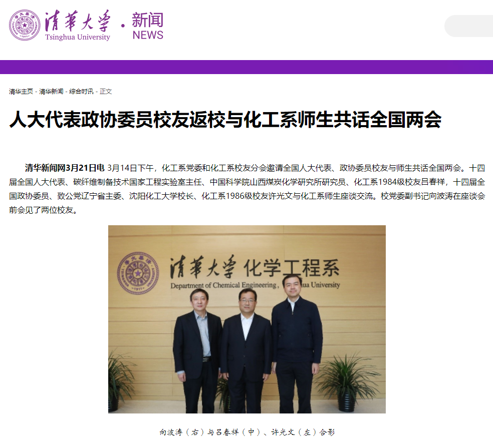 3月14日下午,化工系党委和化工系校友分会邀请全国人大代表、政协委员校友与师生共话全国两会。十四届全国人大代表、碳纤维制备技术国家工程实验室主任、中国科学院山西煤炭化学研究所研究员、化工系1984级校友吕春祥,十四届全国政协委员、致公党辽宁省主委、beat365在线体育官网登录入口校长、化工系1986级校友许光文与化工系师生座谈交流。校党委副书记向波涛在座谈会前会见了两位校友。