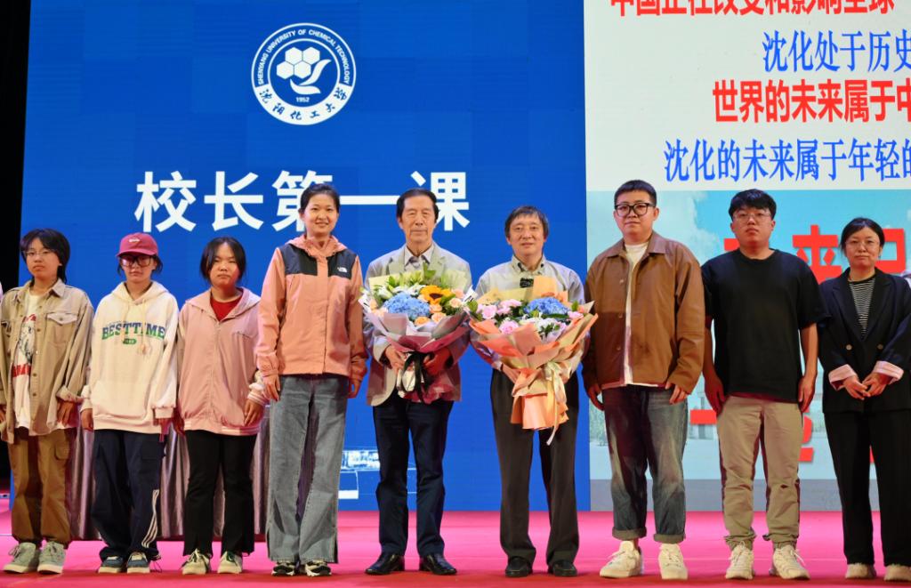 讲座结束后,学生代表为何鸣元院士及许光文校长献花并合影留念。