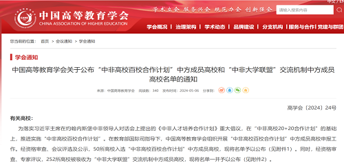 为落实习近平总书记在约翰内斯堡中非领导人对话会上提出的《中非人才培养合作计划》重大倡议,在“中非高校20+20合作计划”的基础上,推进实施“中非高校百校合作计划”。在教育部国际司指导下,中国高等教育学会组织开展“中非高校百校合作计划”中方成员高校申报工作。经资格审查、会议评选及公示,50所高校入选“中非高校百校合作计划”中方成员高校。同时,经资格审查、专家评议,252所高校被吸收为“中非大学联盟”交流机制中方成员高校。