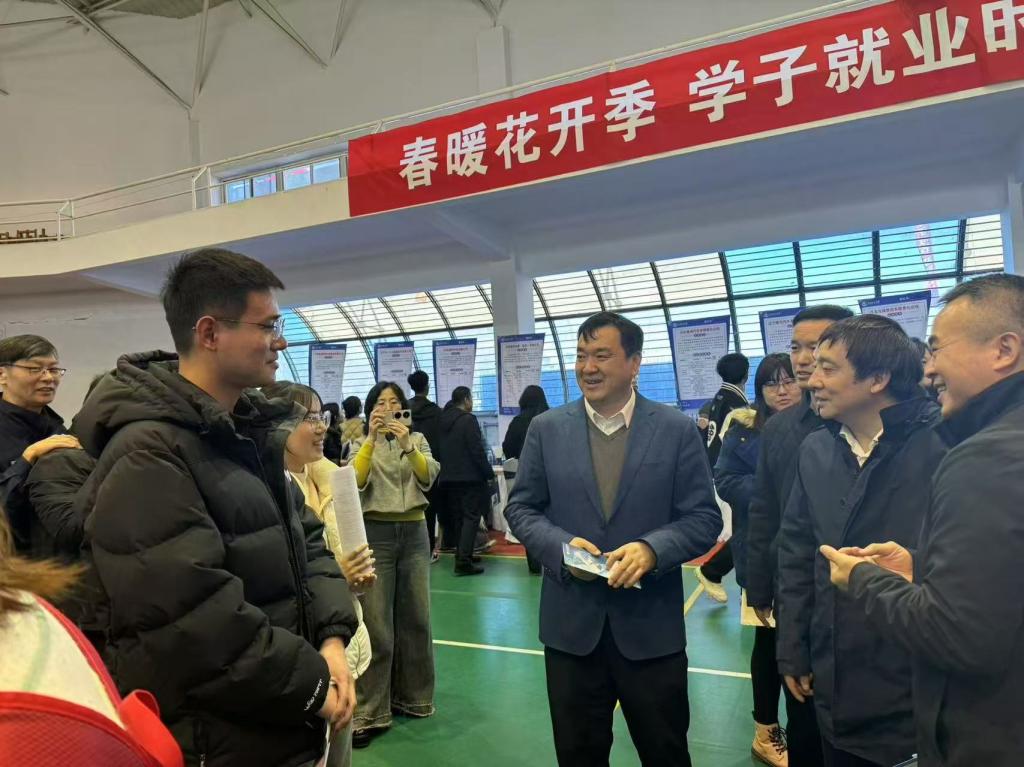 党委书记周志强,校长许光文,党委副书记汪滢,党委常委、纪委书记牛巨龙,党委常委、副校长王国刚、王树荣等学校领导在招聘会现场同企业代表和求职学生亲切交流。