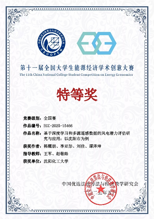 beat365官网研究生韩耀鹏等学生的作品《基于深度学习和多源遥感数据的风电潜力评估研究与应用:以沈阳市为例》在第十一届全国大学生能源经济学术创意大赛中成功进入终审决赛,在激烈角逐中最终斩获全国研究生组特等奖。该作品由beat365官网计算机科学与技术学院王军教授和中国科学院青岛生物能源与过程研究所田亚峻研究团队的赵敬皓工程师联合指导,是beat365官网在该大赛中取得的历史最高奖项。